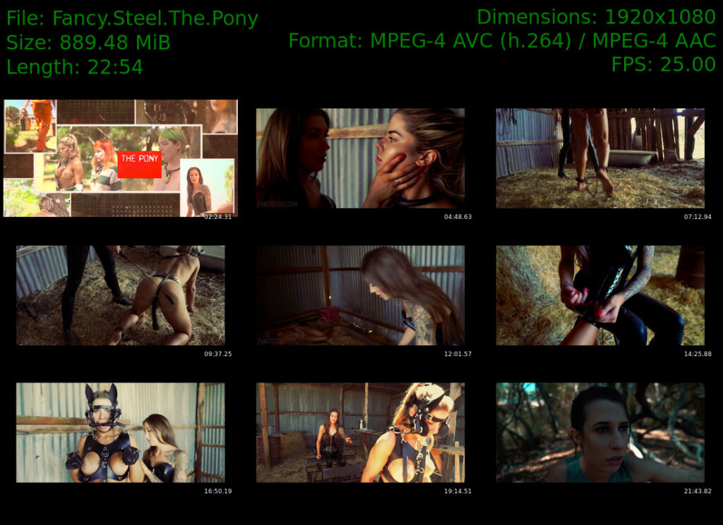 This fetish movie explores pony play, pet play, full body leather harness, chastity belt, pony hoof boots, humiliation, bondage, chastity, and discipline.